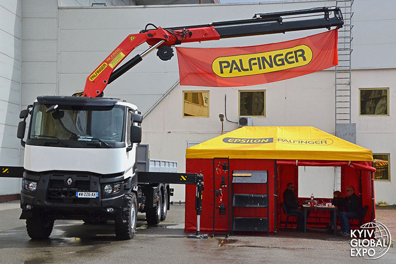 The crane company "Spetstechservice" had an interesting stand. Here you could see a Renault Trucks K series (6x6) all‑wheel drive truck equipped with an onboard platform and a powerful Palfinger PK 23500 crane‑manipulator ‑ with a lifting capacity of up to 10,000 kg and a maximum reach of 16.7 m.